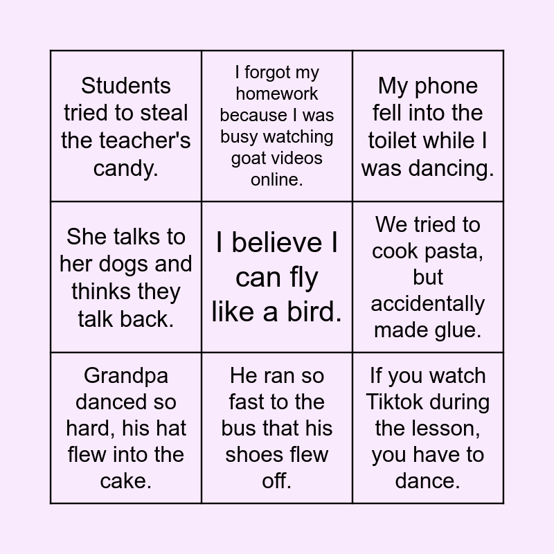This bingo card has 9 words: Grandpa danced so hard, his hat flew into the cake., My phone fell into the toilet while I was dancing., I forgot my homework because I was busy watching goat videos online., She talks to her dogs and thinks they talk back., Students tried to steal the teacher's candy., We tried to cook pasta, but accidentally made glue., I believe I can fly like a bird., If you watch Tiktok during the lesson, you have to dance. and He ran so fast to the bus that his shoes flew off..