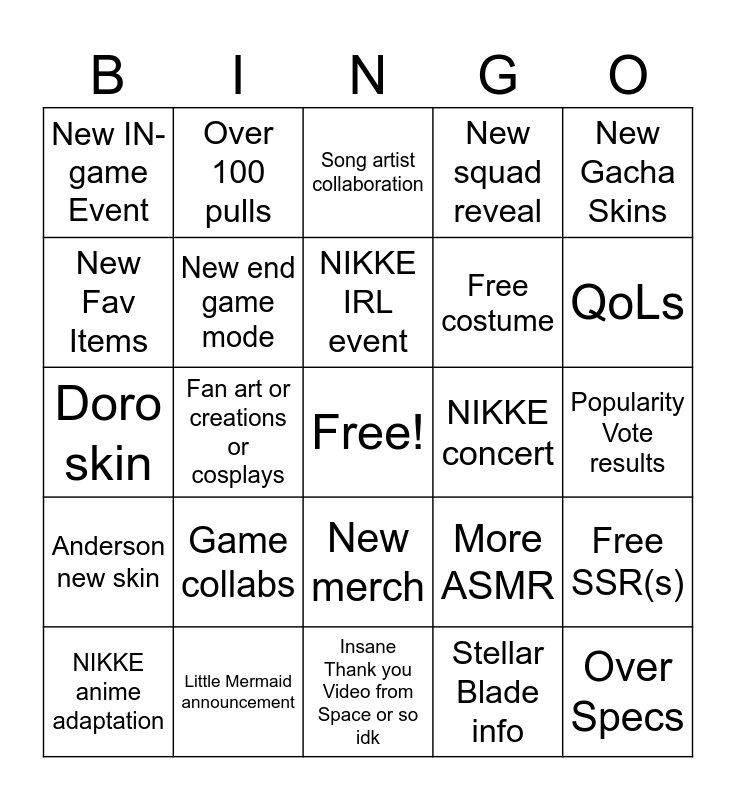 This bingo card has a free space and 24 words: Game collabs, Little Mermaid announcement, NIKKE IRL event, NIKKE anime adaptation, New Gacha Skins, New IN-game Event, New Fav Items, Over 100 pulls, NIKKE concert, New merch, Free costume, Doro skin, More ASMR, Free SSR(s), New end game mode, Stellar Blade info, Popularity Vote results, Song artist collaboration, QoLs, Fan art or creations or cosplays, Over Specs, Anderson new skin, New squad reveal and Insane Thank you Video from Space or so idk.
