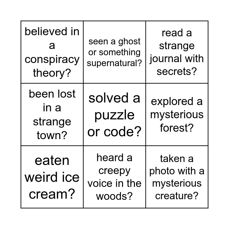 This bingo card has a free space and 8 words: explored a mysterious forest?, read a strange journal with secrets?, seen a ghost or something supernatural?, eaten weird ice cream?, believed in a conspiracy theory?, taken a photo with a mysterious creature?, been lost in a strange town? and heard a creepy voice in the woods?.