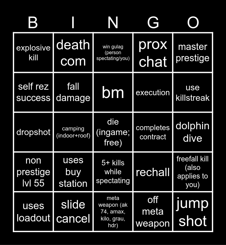 This bingo card has a free space and 29 words: uses loadout, sniper kill, camping (indoor+roof), double digies (10+ kills), explosive kill, win gulag (person spectating/you), fall damage, uses buy station, completes contract, slide cancel, dolphin dive, jump shot, meta weapon (ak 74, amax, kilo, grau, hdr), off meta weapon, use killstreak, legendary chest, 5+ kills while spectating, non prestige lvl 55, master prestige, dropshot, rechall, vehicular manslaughter, execution, self rez success, prox chat, death com, freefall kill (also applies to you), bm and body shield.