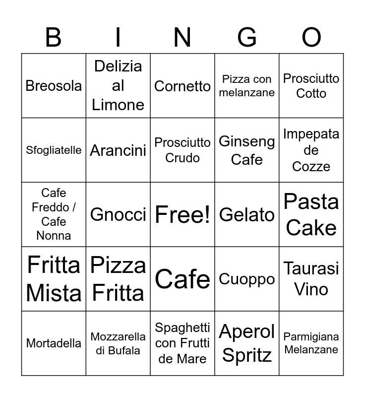 This bingo card has a free space and 24 words: Pizza Fritta, Mozzarella di Bufala, Prosciutto Crudo, Mortadella, Prosciutto Cotto, Breosola, Sfogliatelle, Delizia al Limone, Gelato, Cafe, Ginseng Cafe, Cafe Freddo / Cafe Nonna, Cuoppo, Taurasi Vino, Arancini, Aperol Spritz, Pasta Cake, Cornetto, Impepata de Cozze, Gnocci, Parmigiana Melanzane, Fritta Mista, Pizza con melanzane and Spaghetti con Frutti de Mare.