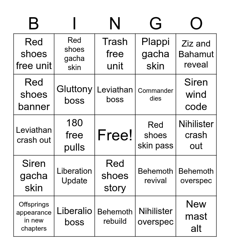 This bingo card has a free space and 24 words: Liberation Update, Liberalio boss, Leviathan boss, Offsprings appearance in new chapters, Ziz and Bahamut reveal, Red shoes free unit, Red shoes banner, Red shoes gacha skin, Red shoes skin pass, Red shoes story, Commander dies, Leviathan crash out, Behemoth revival, Behemoth overspec, Gluttony boss, Nihilister overspec, Nihilister crash out, Trash free unit, Siren wind code, 180 free pulls, New mast alt, Siren gacha skin, Plappi gacha skin and Behemoth rebuild.