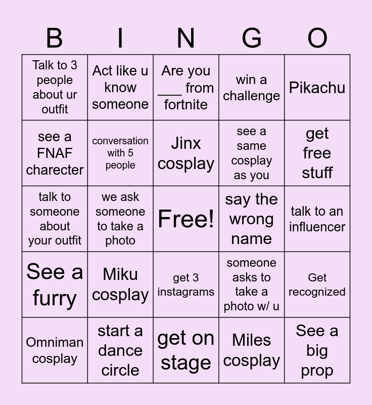 This bingo card has a free space and 24 words: Omniman cosplay, Miku cosplay, Jinx cosplay, Miles cosplay, Pikachu, Talk to 3 people about ur outfit, Act like u know someone, Are you ___ from fortnite, say the wrong name, talk to an influencer, talk to someone about your outfit, conversation with 5 people, someone asks to take a photo w/ u, Get recognized, see a FNAF charecter, start a dance circle, get on stage, win a challenge, get free stuff, See a furry, we ask someone to take a photo, get 3 instagrams, see a same cosplay as you and See a big prop.
