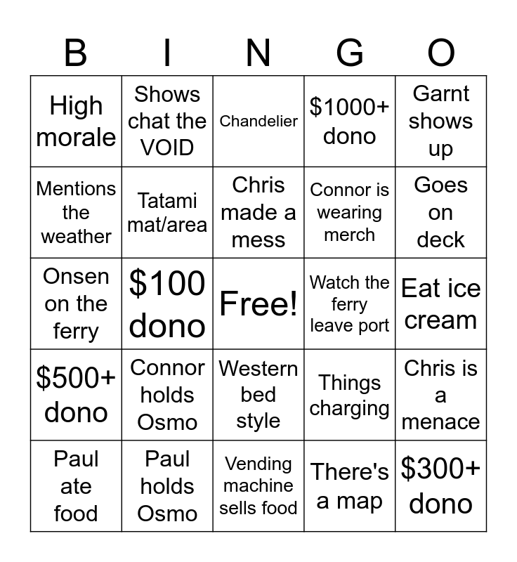 This bingo card has a free space and 24 words: Connor holds Osmo, Paul holds Osmo, Chris made a mess, Paul ate food, Garnt shows up, High morale, Mentions the weather, Shows chat the VOID, Watch the ferry leave port, Western bed style, Connor is wearing merch, Onsen on the ferry, Things charging, Chris is a menace, Tatami mat/area, There's a map, Eat ice cream, Chandelier, Goes on deck, $100 dono, $300+ dono, $500+ dono, $1000+ dono and Vending machine sells food.