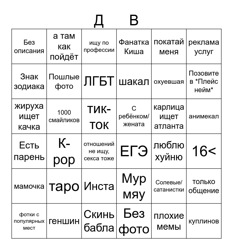 This bingo card has 36 words: Мур мяу, Инста, Без фото, Знак зодиака, Есть парень, С ребёнком/жената, Пошлые фото, Скинь бабла, покатай меня, Солевые/сатанистки, Позовите в *Плейс нейм*, Фанатка Киша, только общение, 1000 смайликов, шакал, Без описания, мамочка, карлица ищет атланта, жируха ищет качка, ищу по профессии, тик-ток, К-рор, ЕГЭ, отношений не ищу, секса тоже, люблю хуйню, а там как пойдёт, охуевшая, геншин, ЛГБТ, реклама услуг, куплинов, фотки с популярных мест, 16<, анимекал, таро and плохие мемы.