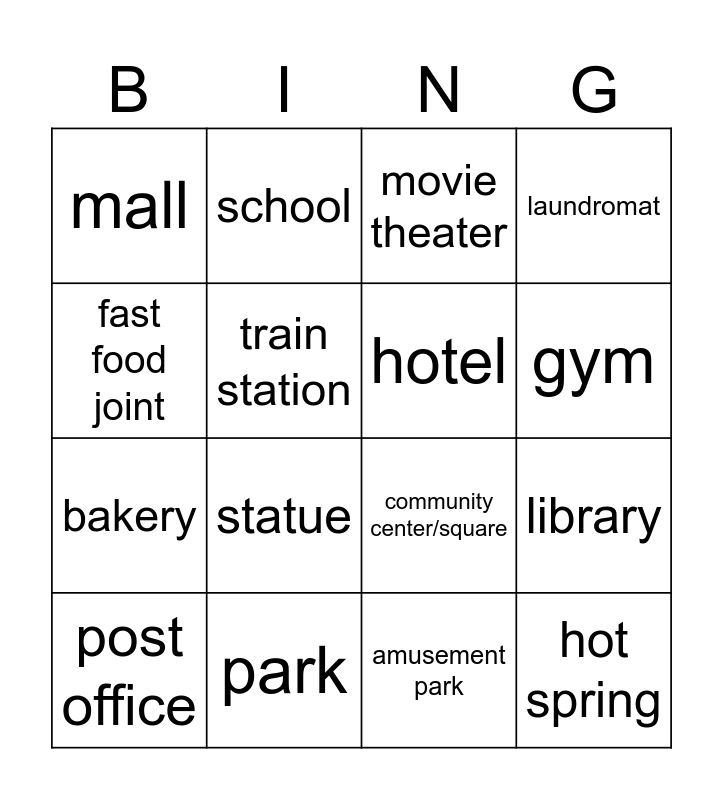 This bingo card has 16 words: park, library, movie theater, mall, bakery, school, community center/square, amusement park, fast food joint, train station, post office, laundromat, statue, gym, hotel and hot spring.