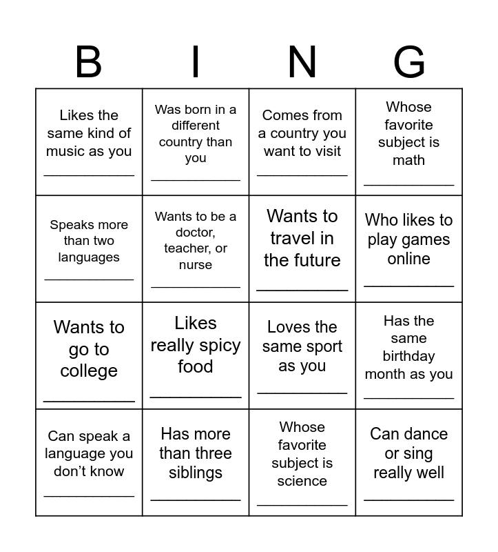 This bingo card has 20 words: Has the same birthday month as you ___________, Has the same kind of pet as you ___________, Comes from a country you want to visit ___________, Has the same favorite food as you ____________, Can speak a language you don’t know ___________, Speaks more than two languages ____________, Has more than three siblings __________, Likes the same kind of music as you ___________, Wants to go to college _________, Was born in a different country than you ____________, Likes really spicy food _________, Loves the same sport as you __________, Wants to be a doctor, teacher, or nurse ____________, Can dance or sing really well __________, Wants to travel in the future _________, Wants to be famous someday __________, Who likes to play games online __________, Whose favorite subject is math ___________, Whose favorite subject is science ___________ and Who watches shows on Netflix ___________.