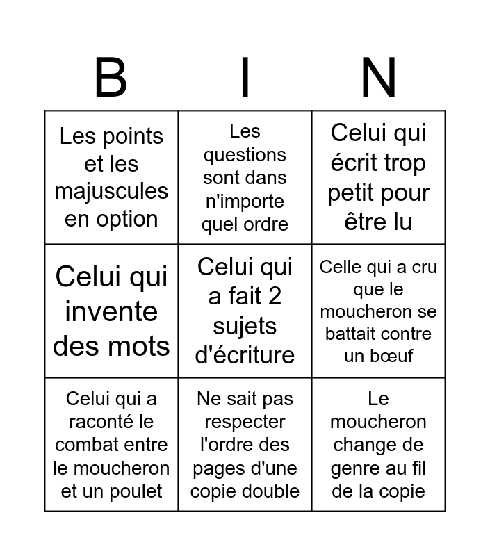 This bingo card has a free space and 8 words: Celle qui a cru que le moucheron se battait contre un bœuf, Celui qui écrit trop petit pour être lu, Les questions sont dans n'importe quel ordre, Celui qui a raconté le combat entre le moucheron et un poulet, Les points et les majuscules en option, Le moucheron change de genre au fil de la copie, Celui qui invente des mots and Ne sait pas respecter l'ordre des pages d'une copie double.