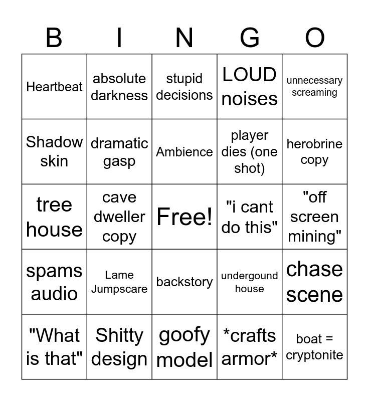 This bingo card has a free space and 24 words: Lame Jumpscare, Shitty design, Ambience, "What is that", unnecessary screaming, Heartbeat, Shadow skin, absolute darkness, "i cant do this", backstory, player dies (one shot), tree house, undergound house, chase scene, dramatic gasp, *crafts armor*, "off screen mining", stupid decisions, herobrine copy, cave dweller copy, boat = cryptonite, spams audio, LOUD noises and goofy model.
