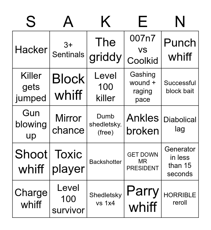 This bingo card has a free space and 24 words: Toxic player, Level 100 survivor, Level 100 killer, Charge whiff, Punch whiff, Hacker, Killer gets jumped, 3+ Sentinals, Ankles broken, Backshotter, Gashing wound + raging pace, Gun blowing up, GET DOWN MR PRESIDENT, Generator in less than 15 seconds, Block whiff, Parry whiff, Diabolical lag, The griddy, Successful block bait, Mirror chance, HORRIBLE reroll, Shoot whiff, 007n7 vs Coolkid and Shedletsky vs 1x4.