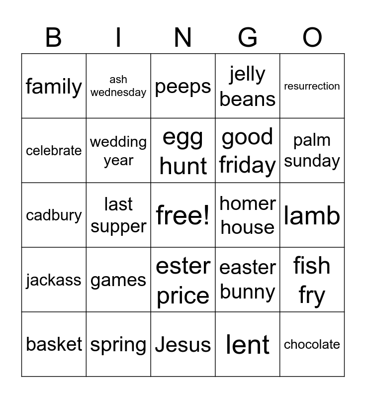 This bingo card has a free space and 24 words: games, spring, egg hunt, basket, resurrection, family, celebrate, ash wednesday, homer house, ester price, good friday, cadbury, easter bunny, fish fry, wedding year, lent, lamb, peeps, palm sunday, last supper, chocolate, jackass, jelly beans and Jesus.