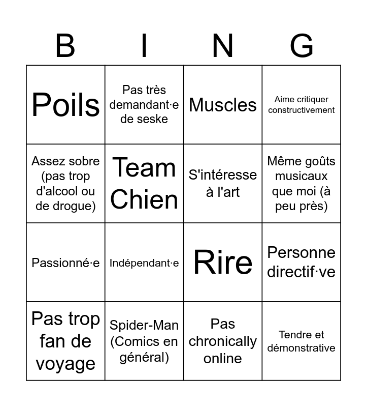 This bingo card has 16 words: Spider-Man (Comics en général), Personne directif·ve, Muscles, Poils, Passionné·e, Pas très demandant·e de seske, Rire, Pas chronically online, Assez sobre (pas trop d'alcool ou de drogue), Team Chien, Pas trop fan de voyage, Aime critiquer constructivement, Indépendant·e, Même goûts musicaux que moi (à peu près), S'intéresse à l'art and Tendre et démonstrative.