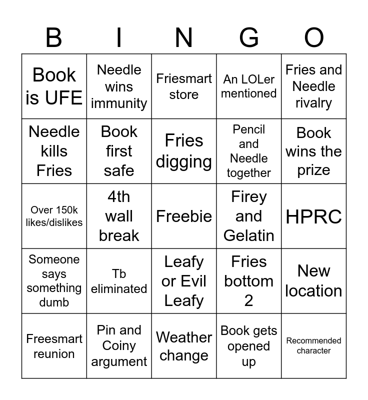 This bingo card has a free space and 24 words: Tb eliminated, Pin and Coiny argument, Fries digging, Freesmart reunion, Fries and Needle rivalry, Book is UFE, Needle kills Fries, Needle wins immunity, Firey and Gelatin, Leafy or Evil Leafy, Pencil and Needle together, Over 150k likes/dislikes, Fries bottom 2, New location, Book first safe, Book gets opened up, HPRC, Friesmart store, Book wins the prize, 4th wall break, Recommended character, Someone says something dumb, An LOLer mentioned and Weather change.