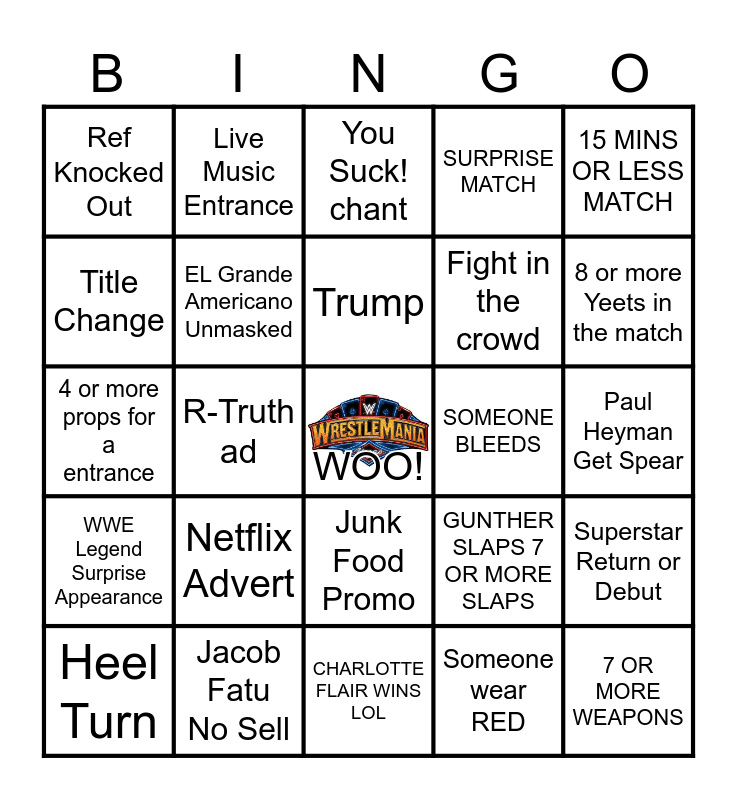 This bingo card has a free space and 24 words: Netflix Advert, Jacob Fatu No Sell, Trump, Heel Turn, 15 MINS OR LESS MATCH, Ref Knocked Out, Title Change, Live Music Entrance, SOMEONE BLEEDS, Junk Food Promo, Fight in the crowd, 4 or more props for a entrance, GUNTHER SLAPS 7 OR MORE SLAPS, Superstar Return or Debut, EL Grande Americano Unmasked, Someone wear RED, Paul Heyman Get Spear, You Suck! chant, 8 or more Yeets in the match, R-Truth ad, 7 OR MORE WEAPONS, WWE Legend Surprise Appearance, SURPRISE MATCH and CHARLOTTE FLAIR WINS LOL.