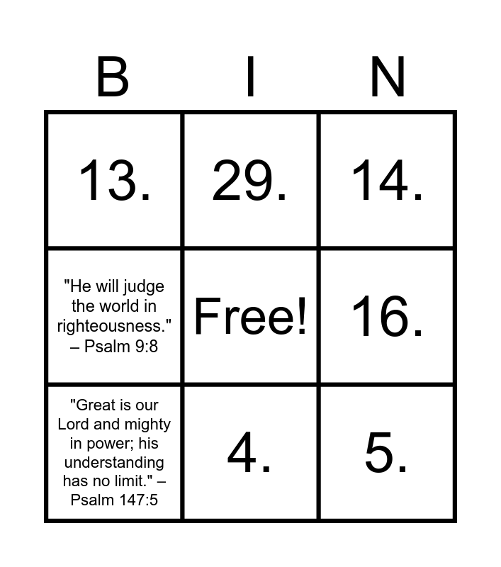 This bingo card has a free space and 40 words: 1., "For nothing will be impossible with God." – Luke 1:37, 2., "Great is our Lord and mighty in power; his understanding has no limit." – Psalm 147:5, 3., "God is love." – 1 John 4:8, 4., "In the beginning, God created the heavens and the earth." – Genesis 1:1, 5., 6., 7., "He will judge the world in righteousness." – Psalm 9:8, 8., 9., 10., 11., 12., 13., "From everlasting to everlasting you are God." – Psalm 90:2, 14., "Now faith is confidence in what we hope for and assurance about what we do not see." – Hebrews 11:1, 15., John 2:1–11, 16., 17., 18., 19., 20., "Ask and it will be given to you." – Matthew 7:7, 21., 22., 23., 24., 25., 26., "Our Father in heaven..." – Matthew 6:9, 27., 28., 29. and 30..