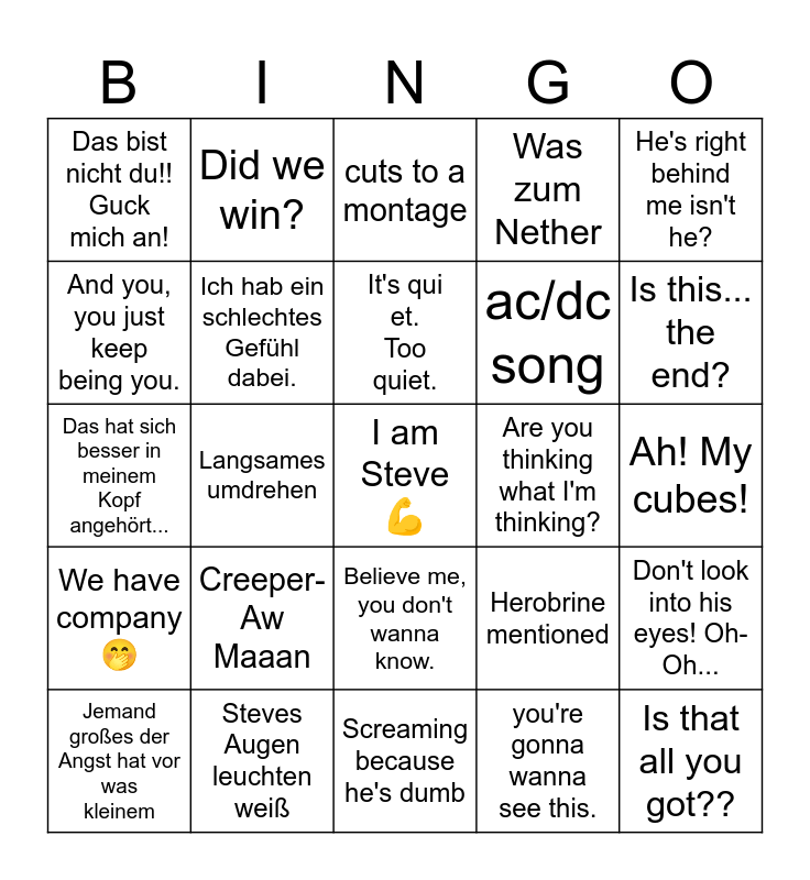 This bingo card has a free space and 24 words: Creeper- Aw Maaan, Steves Augen leuchten weiß, It's quiet. Too quiet., Jemand großes der Angst hat vor was kleinem, He's right behind me isn't he?, Das bist nicht du!! Guck mich an!, And you, you just keep being you., Did we win?, Are you thinking what I'm thinking?, Believe me, you don't wanna know., ac/dc song, Das hat sich besser in meinem Kopf angehört..., Herobrine mentioned, Don't look into his eyes! Oh-Oh..., Ich hab ein schlechtes Gefühl dabei., you're gonna wanna see this., Ah! My cubes!, cuts to a montage, Is this... the end?, Langsames umdrehen, Is that all you got??, We have company🤭, Was zum Nether and Screaming because he's dumb.