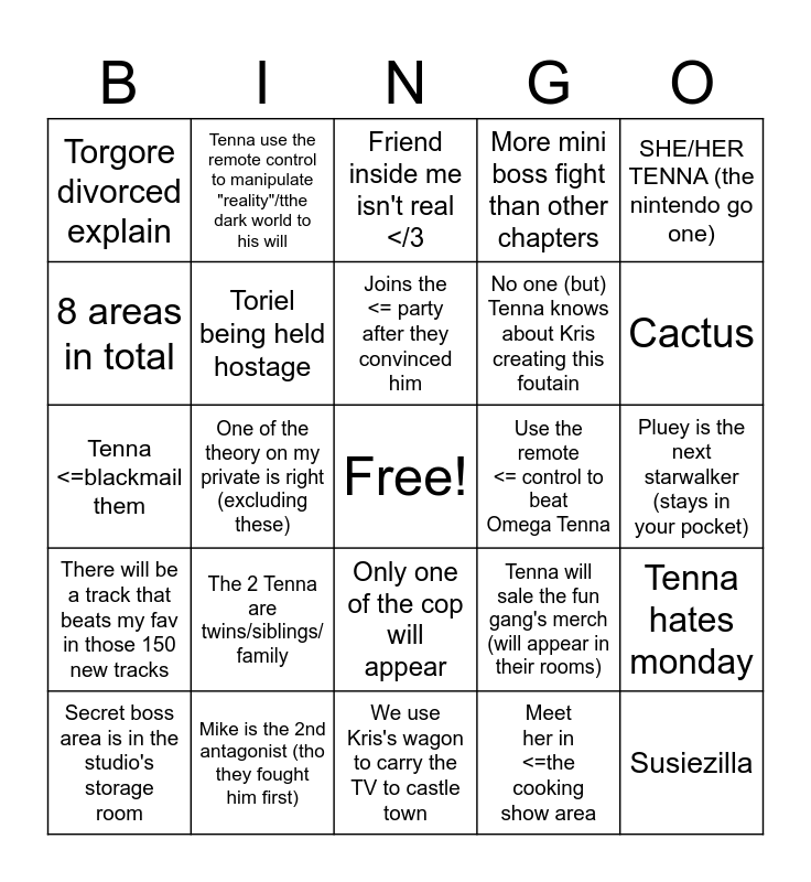 This bingo card has a free space and 24 words: The 2 Tenna are twins/siblings/ family, Mike is the 2nd antagonist (tho they fought him first), Joins the <= party after they convinced him, Secret boss area is in the studio's storage room, SHE/HER TENNA (the nintendo go one), Torgore divorced explain, 8 areas in total, Tenna use the remote control to manipulate "reality"/tthe dark world to his will, Use the remote <= control to beat Omega Tenna, Only one of the cop will appear, No one (but) Tenna knows about Kris creating this foutain, Tenna <=blackmail them, Tenna will sale the fun gang's merch (will appear in their rooms), Tenna hates monday, Toriel being held hostage, Meet her in <=the cooking show area, Pluey is the next starwalker (stays in your pocket), Friend inside me isn't real </3, Cactus, One of the theory on my private is right (excluding these), Susiezilla, There will be a track that beats my fav in those 150 new tracks, More mini boss fight than other chapters and We use Kris's wagon to carry the TV to castle town.