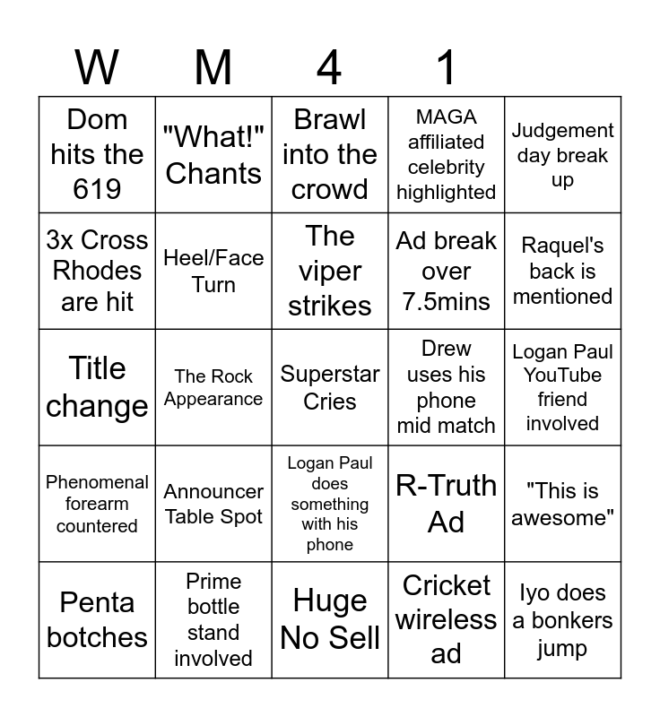 This bingo card has 46 words: "You Suck!", Superstar Cries, Ref bump, Huge No Sell, Announcer Table Spot, Return/Debut, "What!" Chants, Cena wins, 3x Cross Rhodes are hit, Special entrance involves a vehicle, Heel/Face Turn, MAGA affiliated celebrity highlighted, "This is awesome", R-Truth Ad, Head stuck in chair, Mexican destroyer, The viper strikes, Drew uses his phone mid match, Breakker's insane spear, Judgement day break up, The Rock Appearance, Cricket wireless ad, Dom hits the 619, Ad break over 7.5mins, Entrance takes over 5mins, Raquel's back is mentioned, Penta botches, Logan Paul wears his Charizard (or something equally stupid), Logan Paul does something with his phone, Phenomenal forearm countered, Lyra valkryia reference being a bird goddess (or close enough, Liv does something pervy, Rhea does something pervy, Hair whip by Bianca, South of heaven hit by damien, Prime bottle stand involved, Logan Paul YouTube friend involved, All 5 moves of doom, The 6th move of doom, "This is awesome" at an inappropriate time, Iyo does a bonkers jump, Brawl into the crowd, Title change, For the first time in years... No New Day ad, Inappropriate sponsorship for a match/canvas and Celebrity gets involved in a match.