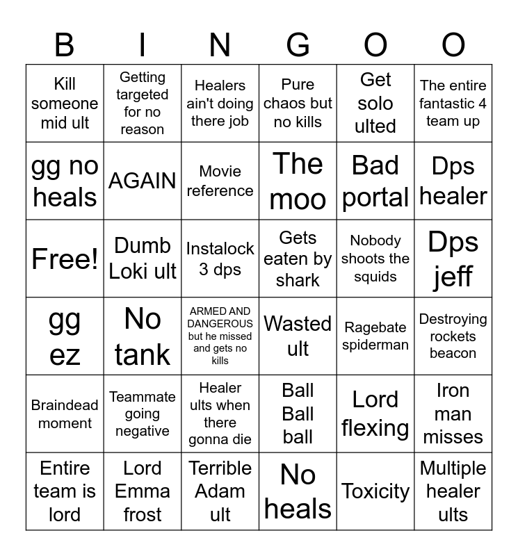 This bingo card has 36 words: Ball Ball ball, Healer ults when there gonna die, No heals, gg no heals, gg ez, Gets eaten by shark, AGAIN, Terrible Adam ult, Get solo ulted, Lord flexing, Dps healer, Pure chaos but no kills, Iron man misses, Dumb Loki ult, The moo, Kill someone mid ult, Braindead moment, Nobody shoots the squids, Free!, Healers ain't doing there job, Instalock 3 dps, No tank, Wasted ult, ARMED AND DANGEROUS but he missed and gets no kills, Ragebate spiderman, Getting targeted for no reason, Bad portal, Lord Emma frost, Movie reference, The entire fantastic 4 team up, Multiple healer ults, Entire team is lord, Destroying rockets beacon, Dps jeff, Teammate going negative and Toxicity.