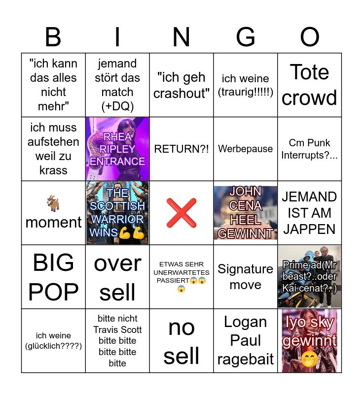 This bingo card has 5 images, a free space and 24 words: ich weine (glücklich????), over sell, RETURN?!, Logan Paul ragebait, Tote crowd, "ich kann das alles nicht mehr", jemand stört das match (+DQ), "ich geh crashout", JOHN CENA HEEL GEWINNT, JEMAND IST AM JAPPEN, 🐐moment, RHEA RIPLEY ENTRANCE, Signature move, Prime ad(Mr beast?..oder Kai cenat?..), ich muss aufstehen weil zu krass, bitte nicht Travis Scott bitte bitte bitte bitte bitte, no sell, ich weine (traurig!!!!!), Cm Punk Interrupts?..., BIG POP, THE SCOTTISH WARRIOR WINS💪💪, ETWAS SEHR UNERWARTETES PASSIERT😱😱😱, Werbepause and Iyo sky gewinnt🤭.