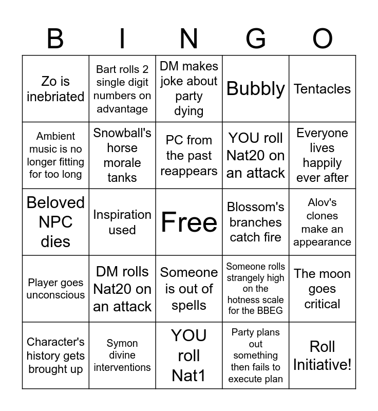 This bingo card has a free space and 24 words: Character's history gets brought up, DM rolls Nat20 on an attack, PC from the past reappears, Party plans out something then fails to execute plan, Tentacles, Zo is inebriated, Bart rolls 2 single digit numbers on advantage, DM makes joke about party dying, Blossom's branches catch fire, Alov's clones make an appearance, Beloved NPC dies, Snowball's horse morale tanks, Someone rolls strangely high on the hotness scale for the BBEG, The moon goes critical, Ambient music is no longer fitting for too long, Symon divine interventions, YOU roll Nat1, Bubbly, Everyone lives happily ever after, Player goes unconscious, Inspiration used, Someone is out of spells, YOU roll Nat20 on an attack and Roll Initiative!.