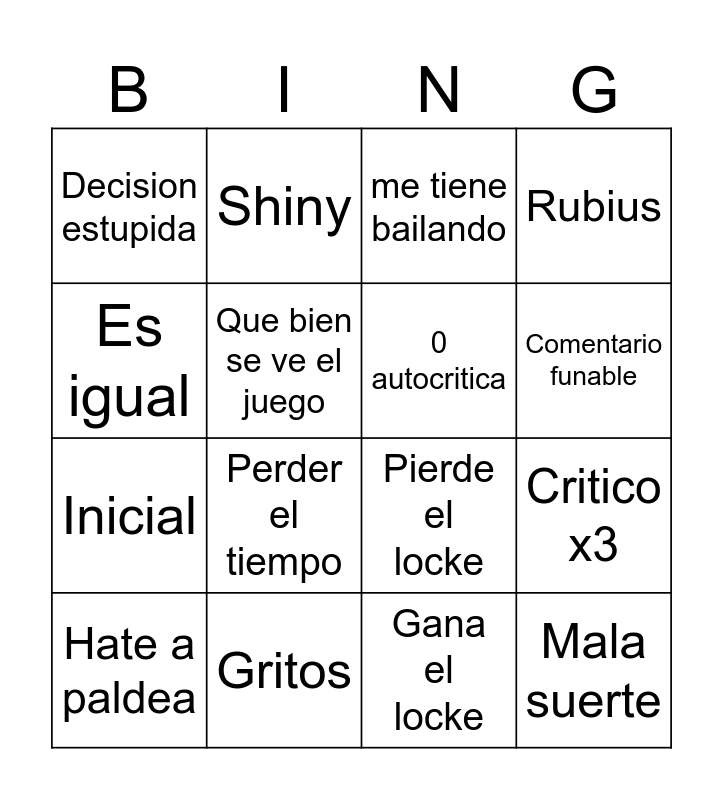 This bingo card has 16 words: Gritos, Critico x3, me tiene bailando, Decision estupida, Inicial, Shiny, Pierde el locke, Gana el locke, Es igual, Que bien se ve el juego, Hate a paldea, Rubius, Perder el tiempo, Comentario funable, 0 autocritica and Mala suerte.