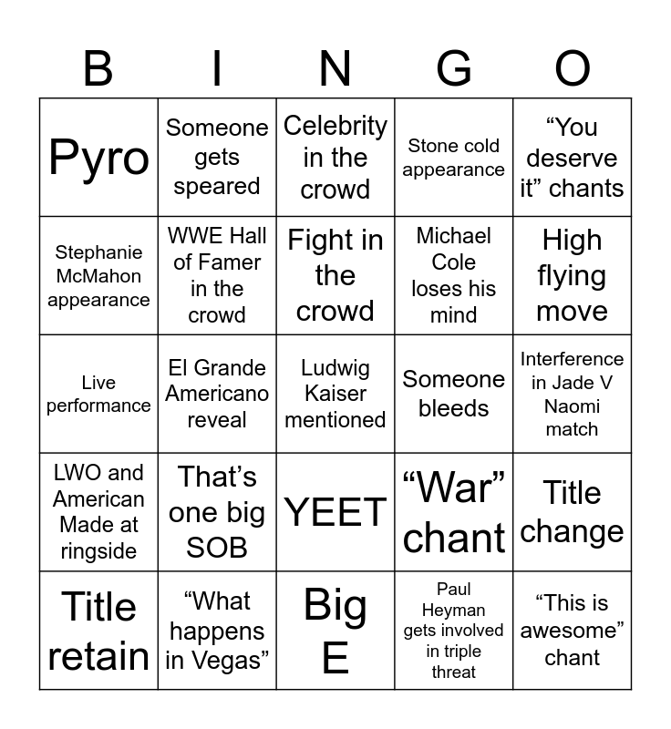 This bingo card has 30 words: “What happens in Vegas”, Solo interferes in Fatu match, El Grande Americano reveal, The Shield, Pyro, Celebrity in the crowd, WWE Hall of Famer in the crowd, YEET, Someone bleeds, Big E, Interference in Jade V Naomi match, Ludwig Kaiser mentioned, Paul Heyman gets involved in triple threat, “This is awesome” chant, High flying move, Weapons, “War” chant, LWO and American Made at ringside, That’s one big SOB, “You deserve it” chants, Live performance, A match is won by submission, Someone gets speared, Michael Cole loses his mind, Stephanie McMahon appearance, Stone cold appearance, Title change, Title retain, Fight in the crowd and Jimmy Uso.