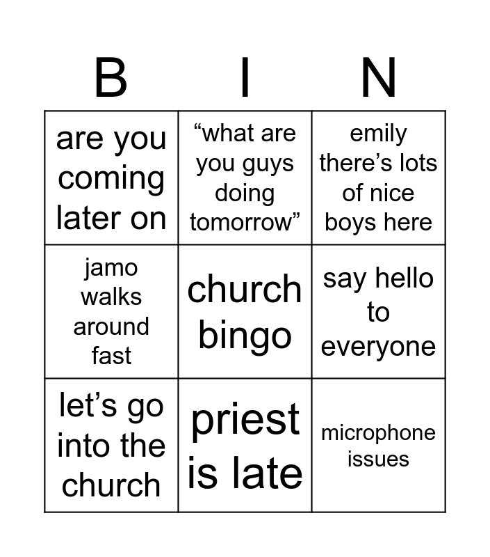 This bingo card has a free space and 8 words: say hello to everyone, emily there’s lots of nice boys here, “what are you guys doing tomorrow”, let’s go into the church, are you coming later on, microphone issues, jamo walks around fast and priest is late.
