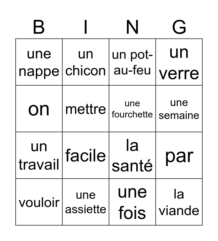 This bingo card has 21 words: une assiette, un boucher, un chicon, un couteau, une fois, une fourchette, une nappe, un pot-au-feu, la santé, une semaine, un travail, un verre, la viande, détester, mettre, pouvoir, vouloir, facile, on, par and y.