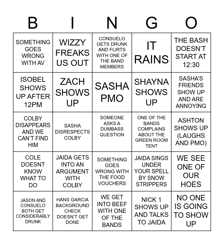 This bingo card has a free space and 24 words: JAIDA GETS INTO AN ARGUMENT WITH COLBY, HANS GARCIA BACKGROUND CHECK DOESN’T GET DONE, SASHA PMO, JASON AND CONSUELO BOTH GET CONSIDERABLY DRUNK, THE BASH DOESN’T START AT 12:30, SOMETHING GOES WRONG WITH AV, ISOBEL SHOWS UP AFTER 12PM, WIZZY FREAKS US OUT, ONE OF THE BANDS COMPLAINS ABOUT THE GREEN ROOM TENT, SOMETHING GOES WRONG WITH THE FOOD VOUCHERS, SHAYNA SHOWS UP, COLBY DISAPPEARS AND WE CAN’T FIND HIM, JAIDA SINGS UNDER YOUR SPELL BY SNOW STRIPPERS, WE SEE ONE OF OUR HOES, ZACH SHOWS UP, NICK 1 SHOWS UP AND TALKS TO JAIDA, ASHTON SHOWS UP (LAUGHS AND PMO), CONSUELO GETS DRUNK AND FLIRTS WITH ONE OF THE BAND MEMBERS, SASHA’S FRIENDS SHOW UP AND ARE ANNOYING, SASHA DISRESPECTS COLBY, NO ONE IS GOING TO SHOW UP, COLE DOESNT KNOW WHAT TO DO, IT RAINS and WE GET INTO BEEF WITH ONE OF THE BANDS.