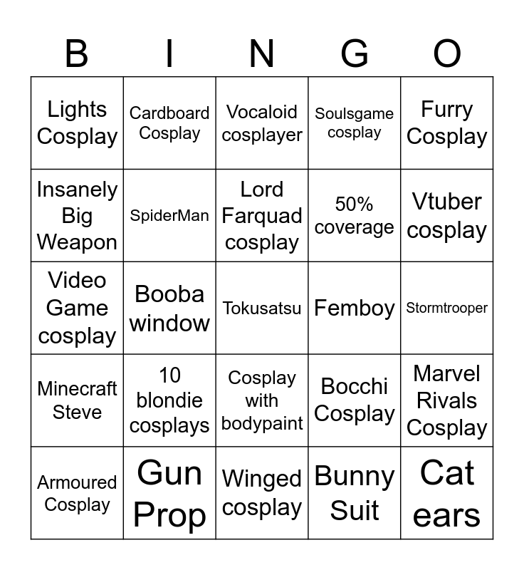 This bingo card has a free space and 24 words: 10 blondie cosplays, Gun Prop, Lord Farquad cosplay, Armoured Cosplay, Furry Cosplay, Lights Cosplay, Insanely Big Weapon, Cardboard Cosplay, Femboy, Cosplay with bodypaint, 50% coverage, Video Game cosplay, Bocchi Cosplay, Marvel Rivals Cosplay, SpiderMan, Bunny Suit, Stormtrooper, Vocaloid cosplayer, Vtuber cosplay, Booba window, Cat ears, Minecraft Steve, Soulsgame cosplay and Winged cosplay.