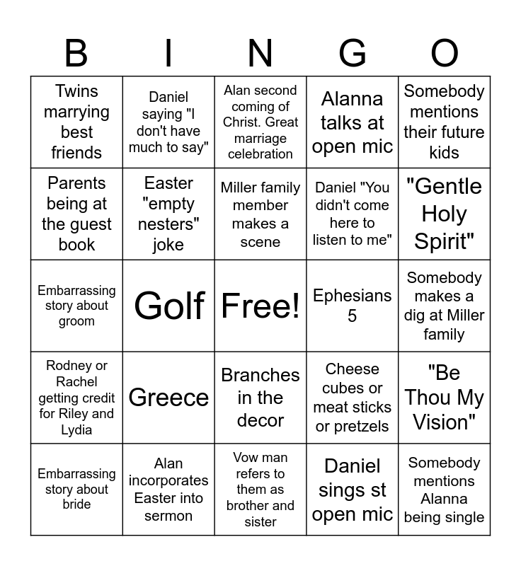 This bingo card has a free space and 24 words: Greece, Alan incorporates Easter into sermon, Miller family member makes a scene, Embarrassing story about bride, Somebody mentions their future kids, Twins marrying best friends, Parents being at the guest book, Daniel saying "I don't have much to say", Ephesians 5, Branches in the decor, Daniel "You didn't come here to listen to me", Embarrassing story about groom, Cheese cubes or meat sticks or pretzels, "Be Thou My Vision", Easter "empty nesters" joke, Daniel sings st open mic, Somebody makes a dig at Miller family, Alan second coming of Christ. Great marriage celebration, "Gentle Holy Spirit", Golf, Somebody mentions Alanna being single, Rodney or Rachel getting credit for Riley and Lydia, Alanna talks at open mic and Vow man refers to them as brother and sister.