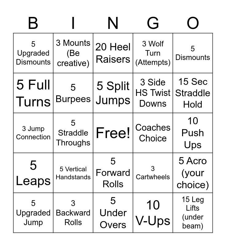 This bingo card has a free space and 24 words: 5 Vertical Handstands, 3 Backward Rolls, 5 Split Jumps, 5 Upgraded Jump, 5 Dismounts, 5 Upgraded Dismounts, 5 Full Turns, 3 Mounts (Be creative), Coaches Choice, 5 Forward Rolls, 3 Side HS Twist Downs, 3 Jump Connection, 3 Cartwheels, 5 Acro (your choice), 5 Burpees, 10 V-Ups, 10 Push Ups, 20 Heel Raisers, 15 Sec Straddle Hold, 5 Straddle Throughs, 15 Leg Lifts (under beam), 5 Leaps, 3 Wolf Turn (Attempts) and 5 Under Overs.