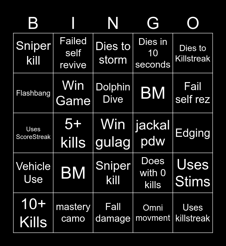 This bingo card has a free space and 49 words: Win game, Execution, Bush camping, Omni movment, Edging, TTV (Etc), Failed self revive, Use smokes, BM, AFK, Flashbang, 5+ kills, Does with 0 kills, Uses killstreak, Uses loadout, Explosion death, Dies to storm, jackal pdw, Dies to bot, Sniper kill, mastery camo, Fall damage, Dies in 10 seconds, Dies to Killstreak, AFK, BM, Dolphin Dive, Scuba Steve, Uses Stims, Vehicle Use, Riot shield kill, Sniper kill, Throwing knife kill, Dies in 10 Seconds, 10+ Kills, Dies with 0 kills, Win Gulag, Explosion Kill, Fail self rez, JailBreak, Fall Damage, Death Cam, Dies in zone, TTV (etc), Uses ScoreStreak, Win Game, The boys skins, Roof Camping and Use Loadout.