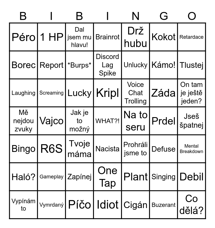 This bingo card has 62 words: Rusher, Mě nejdou zvuky, Skill Issue, Screaming, WHAT?!, Debil, Retardace, Camper, Report, Vypínám to, Brainrot, One Tap, Kokot, Na to seru, Co dělá?, Péro, Kámo!, Drž hubu, Cheater, Borec, Tlustej, Dal jsem mu hlavu!, On tam je ještě jeden?, Jak je to možný, N Word, Prohráli jsme to, R6S, 3x Samé Slovo, Záda, Mental Breakdown, Mě to nebaví, Zapínej, Buzerant, Čůrák, Laughing, 1 HP, Plant, Defuse, Unlucky, Prdel, Discord Lag Spike, Singing, Lucky, Jak to?, *Burps*, Voice Chat Trolling, Tvoje máma, Vymrdaný, Idiot, Cigán, Kripl, Vajco, Vole, Gameplay, Stojí, Jseš špatnej, Nacista, Haló?, Píčo, Jsou tam všichni!, Bingo and Rasismus.