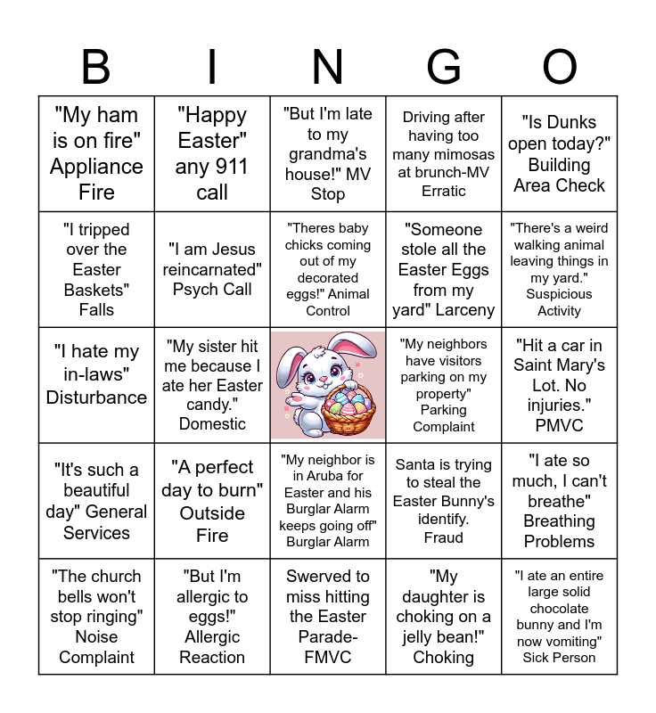 This bingo card has a free space and 24 words: "A perfect day to burn" Outside Fire, "But I'm allergic to eggs!" Allergic Reaction, "Theres baby chicks coming out of my decorated eggs!" Animal Control, "The church bells won't stop ringing" Noise Complaint, "Is Dunks open today?" Building Area Check, "My ham is on fire" Appliance Fire, "I tripped over the Easter Baskets" Falls, "Happy Easter" any 911 call, "My neighbors have visitors parking on my property" Parking Complaint, "My neighbor is in Aruba for Easter and his Burglar Alarm keeps going off" Burglar Alarm, "Someone stole all the Easter Eggs from my yard" Larceny, "I hate my in-laws" Disturbance, Santa is trying to steal the Easter Bunny's identify. Fraud, "I ate so much, I can't breathe" Breathing Problems, "I am Jesus reincarnated" Psych Call, "My daughter is choking on a jelly bean!" Choking, "Hit a car in Saint Mary's Lot. No injuries." PMVC, "But I'm late to my grandma's house!" MV Stop, "There's a weird walking animal leaving things in my yard." Suspicious Activity, "My sister hit me because I ate her Easter candy." Domestic, "I ate an entire large solid chocolate bunny and I'm now vomiting" Sick Person, "It's such a beautiful day" General Services, Driving after having too many mimosas at brunch-MV Erratic and Swerved to miss hitting the Easter Parade-FMVC.