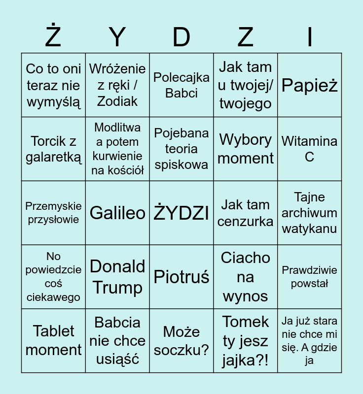This bingo card has a free space and 24 words: Donald Trump, Babcia nie chce usiąść, Pojebana teoria spiskowa, Tablet moment, Papież, Co to oni teraz nie wymyślą, Torcik z galaretką, Wróżenie z ręki / Zodiak, Jak tam cenzurka, Piotruś, Wybory moment, Przemyskie przysłowie, Ciacho na wynos, Prawdziwie powstał, Modlitwa a potem kurwienie na kościół, Tomek ty jesz jajka?!, Tajne archiwum watykanu, Polecajka Babci, Witamina C, Galileo, Ja już stara nie chce mi się. A gdzie ja, No powiedzcie coś ciekawego, Jak tam u twojej/ twojego and Może soczku?.