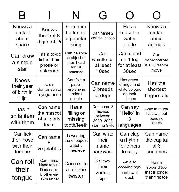 This bingo card has 36 words: Can write their name backward, Is wearing the cheapest watch / timepiece, Knows their zodiac sign, Can draw a simple star, Has a shifa item with them, Can name 3 breeds of dogs, Has a to-do list in their phone or notebook, Can recite a tongue twister, Has a reusable water bottle, Can clap a rhythm for others to copy, Can demonstrate a silly dance move, Can name 2 constellations, Can name the capital of 3 countries, Can demonstrate a yoga pose, Can whistle for at least 10sec, Knows a fun fact about space, Can lick their nose with their tongue, Has green, orange, and white colours on their clothes, Knows their year of birth in Hijri, Can hum the tune of a popular song, Can fold a paper airplane in under 1 minute, Can name the mascot of a sports team, Can name 3 movies between 2020–2025 starring SRK, Has a filling or missing tooth/teeth, Can say "Hello" in 3 languages, Knows the first 6 digits of Pi, Can stand on 1 leg for at least 30sec, Can name Nanasab’s / Dadasab’s brother-in-law's father, Can balance an object on their head for 10 seconds, Knows a fun fact about animals, Has a second toe that is longer than first toe, Can roll their tongue, Able to touch toes without bending knees, Has the shortest fingernails, Can name 5 vegetables and Able to convincingly imitate a duck.