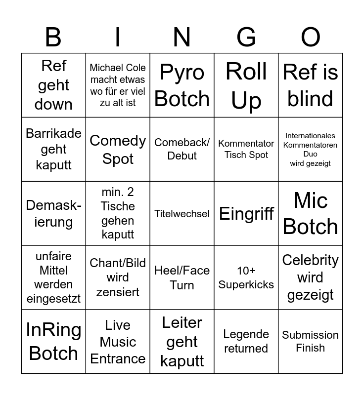 This bingo card has a free space and 24 words: Chant/Bild wird zensiert, Live Music Entrance, Comeback/ Debut, InRing Botch, Ref is blind, Ref geht down, Barrikade geht kaputt, Michael Cole macht etwas wo für er viel zu alt ist, Eingriff, Heel/Face Turn, Kommentator Tisch Spot, Demask- ierung, 10+ Superkicks, Celebrity wird gezeigt, Comedy Spot, Legende returned, Mic Botch, Pyro Botch, Internationales Kommentatoren Duo wird gezeigt, min. 2 Tische gehen kaputt, Submission Finish, unfaire Mittel werden eingesetzt, Roll Up and Leiter geht kaputt.