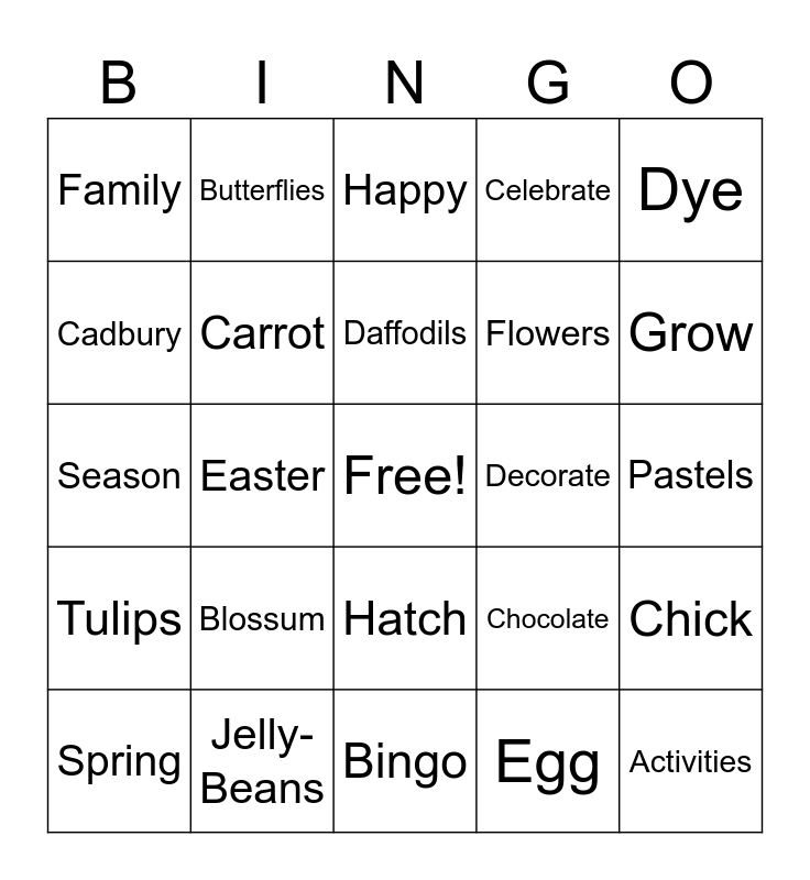 This bingo card has a free space and 50 words: April, Activities, Basket, Bingo, Blossum, Bunny, Butterflies, Break, Cadbury, Candy, Carrot, Celebrate, Chick, Chocolate, Color, Cottontail, Daffodils, Decorate, Duckling, Dye, Easter, Egg, Family, Flowers, Good-Friday, Grass, Grow, Ham, Happy, Hatch, Hide, Hop, Holiday, Hunt, Jelly-Beans, Lamb, Lillys, New, Nest, Pastels, Painting, Parade, Peeps, Rabbit, Spring, Season, Sunday, Sweet, Tulips and Traditions.