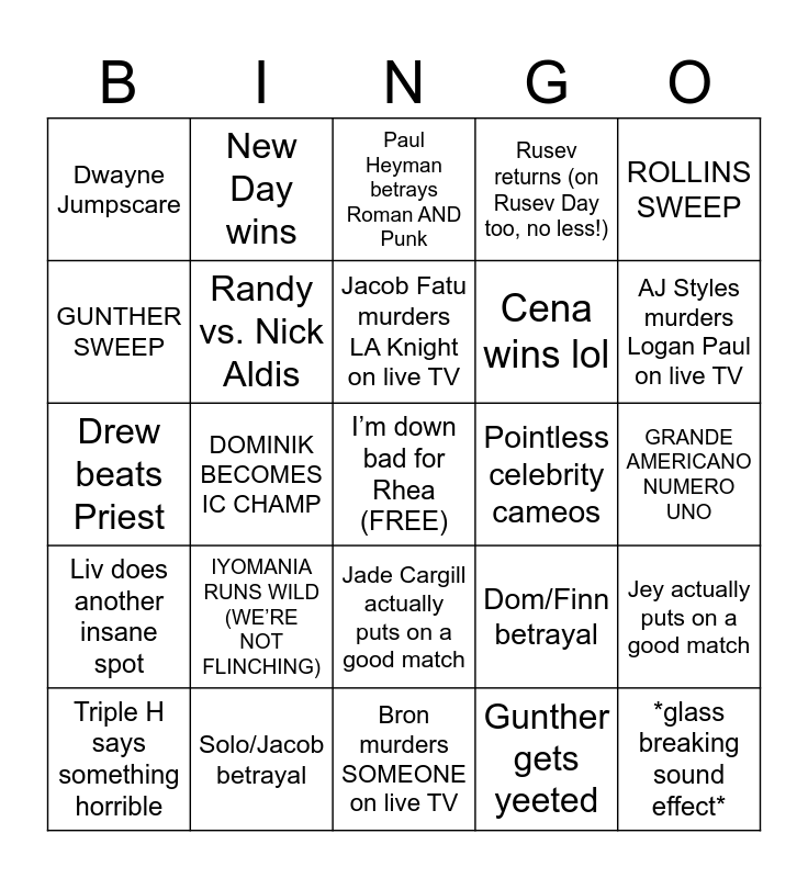 This bingo card has a free space and 24 words: Triple H says something horrible, IYOMANIA RUNS WILD (WE’RE NOT FLINCHING), Jacob Fatu murders LA Knight on live TV, Gunther gets yeeted, ROLLINS SWEEP, Dwayne Jumpscare, New Day wins, Paul Heyman betrays Roman AND Punk, Pointless celebrity cameos, GRANDE AMERICANO NUMERO UNO, Drew beats Priest, Randy vs. Nick Aldis, Dom/Finn betrayal, Jey actually puts on a good match, GUNTHER SWEEP, Solo/Jacob betrayal, Bron murders SOMEONE on live TV, Rusev returns (on Rusev Day too, no less!), AJ Styles murders Logan Paul on live TV, Liv does another insane spot, DOMINIK BECOMES IC CHAMP, Jade Cargill actually puts on a good match, Cena wins lol and *glass breaking sound effect*.