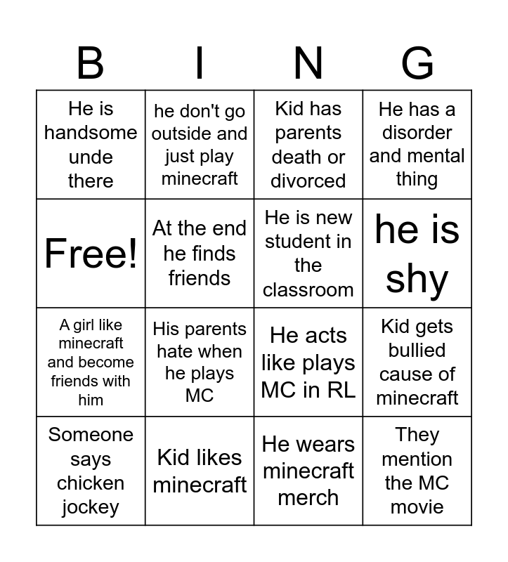 This bingo card has 16 words: Kid likes minecraft, Kid gets bullied cause of minecraft, Kid has parents death or divorced, He is handsome unde there, A girl like minecraft and become friends with him, he don't go outside and just play minecraft, He acts like plays MC in RL, He wears minecraft merch, Free!, At the end he finds friends, Someone says chicken jockey, He has a disorder and mental thing, His parents hate when he plays MC, he is shy, He is new student in the classroom and They mention the MC movie.