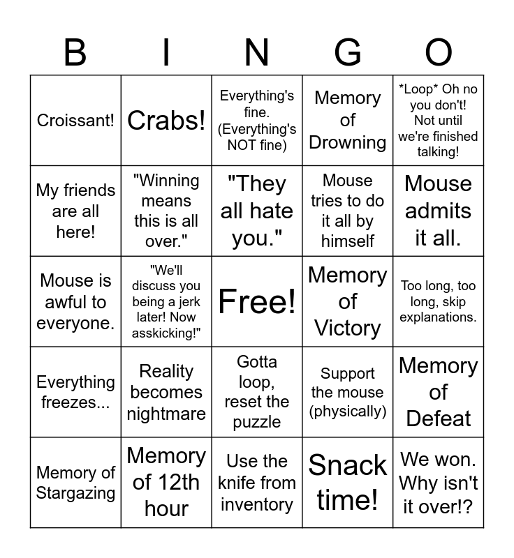 This bingo card has a free space and 24 words: Reality becomes nightmare, Memory of 12th hour, "They all hate you.", Memory of Stargazing, *Loop* Oh no you don't! Not until we're finished talking!, Croissant!, My friends are all here!, Crabs!, Memory of Victory, Gotta loop, reset the puzzle, Mouse tries to do it all by himself, Mouse is awful to everyone., Support the mouse (physically), Memory of Defeat, "Winning means this is all over.", Snack time!, Too long, too long, skip explanations., Everything's fine. (Everything's NOT fine), Mouse admits it all., "We'll discuss you being a jerk later! Now asskicking!", We won. Why isn't it over!?, Everything freezes..., Memory of Drowning and Use the knife from inventory.