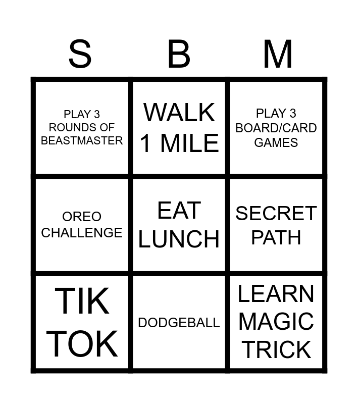 This bingo card has a free space and 9 words: TIK TOK, WALK 1 MILE, SECRET PATH, PLAY 3 ROUNDS OF BEASTMASTER, PLAY 3 BOARD/CARD GAMES, OREO CHALLENGE, DODGEBALL, LEARN MAGIC TRICK and SPIRIT.