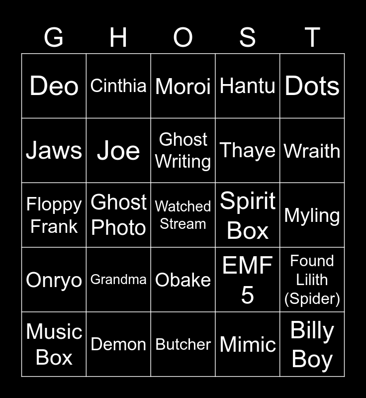 This bingo card has a free space and 52 words: Abigail, Billy Boy, Found Bone, Butcher, Grandma, Grandpa, Cinthia, Sarah, Jaws, Clive, Joe, Jerky Jenkins, Found Lilith (Spider), EMF 5, Freezing, Gorbs, Ghost Writing, Spirit Box, UV, Dots, Ghost Photo, Mimic, Deo, Thaye, Rev, Banshee, Spirit, Polty, Wraith, Phantom, Yurie, Hantu, Twins, Mare, Yokai, Moroi, Demon, Jinn, Shade, Oni, Goryo, Myling, Onryo, Raiju, Obake, Monkey Paw, Ouija, Floppy Frank, Tarot, Mirror, Music Box and Summoning Circle.