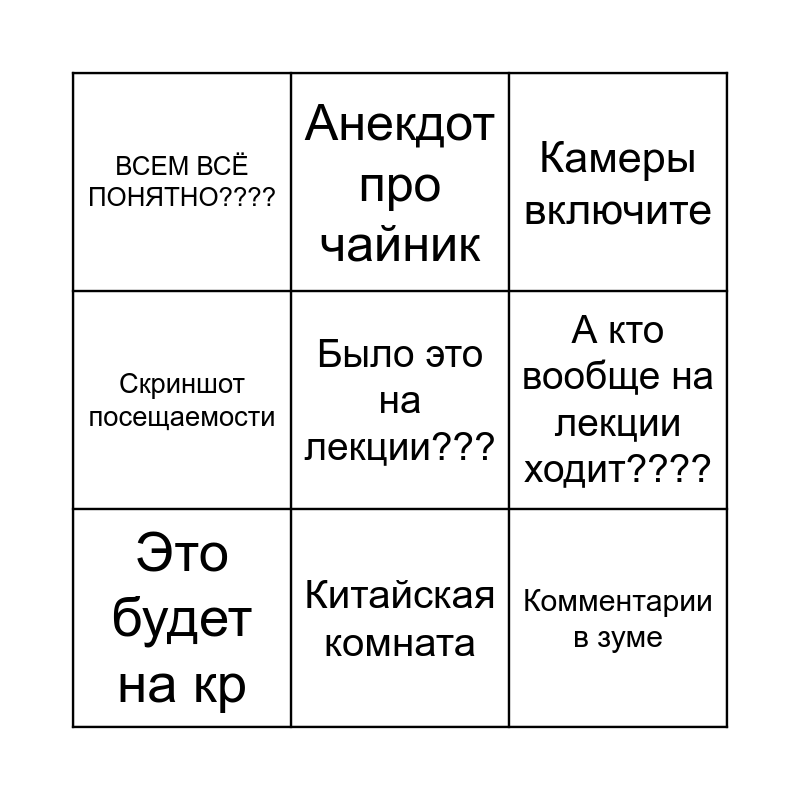 This bingo card has 9 words: Это будет на кр, Камеры включите, Анекдот про чайник, Скриншот посещаемости, ВСЕМ ВСЁ ПОНЯТНО????, А кто вообще на лекции ходит????, Было это на лекции???, Комментарии в зуме and Китайская комната.