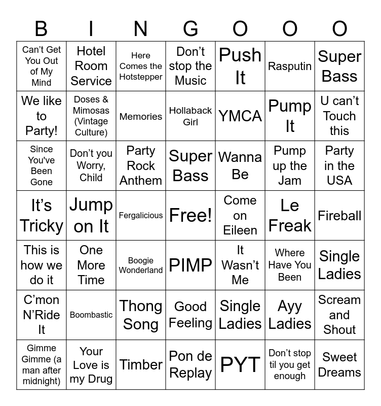 This bingo card has a free space and 63 words: Get Ready for This, Fireball, Calabria 2008, Pump up the Jam, Boogie Wonderland, Gimme Gimme (a man after midnight), Hotel Room Service, I Gotta Feeling, We like to Party!, Your Love is my Drug, Super Bass, Single Ladies, Since You've Been Gone, Push It, Super Freak, Rasputin, YMCA, Can’t Get You Out of My Mind, Low, Doses & Mimosas (Vintage Culture), Party Rock Anthem, Don’t you Worry, Child, Don’t stop the Music, One More Time, Give me Everything, Where Have You Been, PIMP, Disco Inferno, Le Freak, C’mon N’Ride It, Ble (Da Ba Dee), Good Feeling, Ice Ice Baby, Dancing Queen, Memories, Party in the USA, Ayy Ladies, Fergalicious, Single Ladies, Super Bass, Hollaback Girl, U can’t Touch this, Scream and Shout, Thrift Shop, Pump It, It’s Tricky, Sweet Dreams, Wanna Be, Timber, PYT, Don’t stop til you get enough, Jump on It, This is how we do it, Country Grammar, Brass Monkey, Here Comes the Hotstepper, Thong Song, It Wasn’t Me, Boombastic, Pon de Replay, I know you Want me, Come on Eileen and Return of the Mack.
