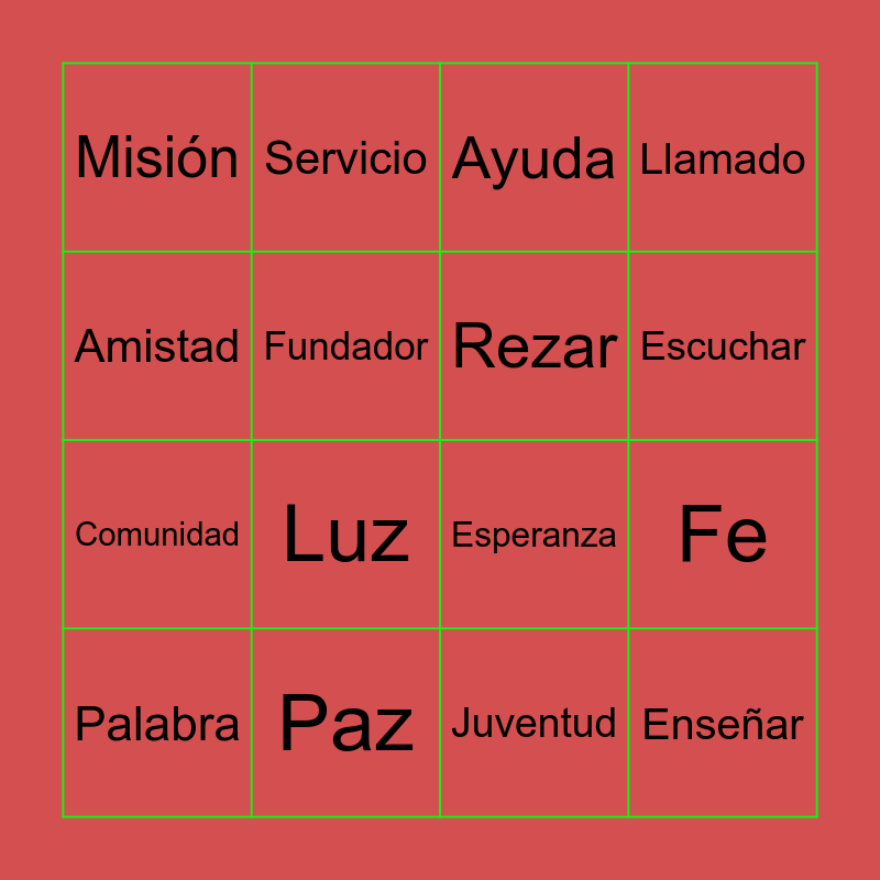 This bingo card has 16 words: Paz, Fe, Ayuda, Misión, Comunidad, Servicio, Esperanza, Juventud, Amistad, Fundador, Palabra, Llamado, Luz, Escuchar, Rezar and Enseñar.