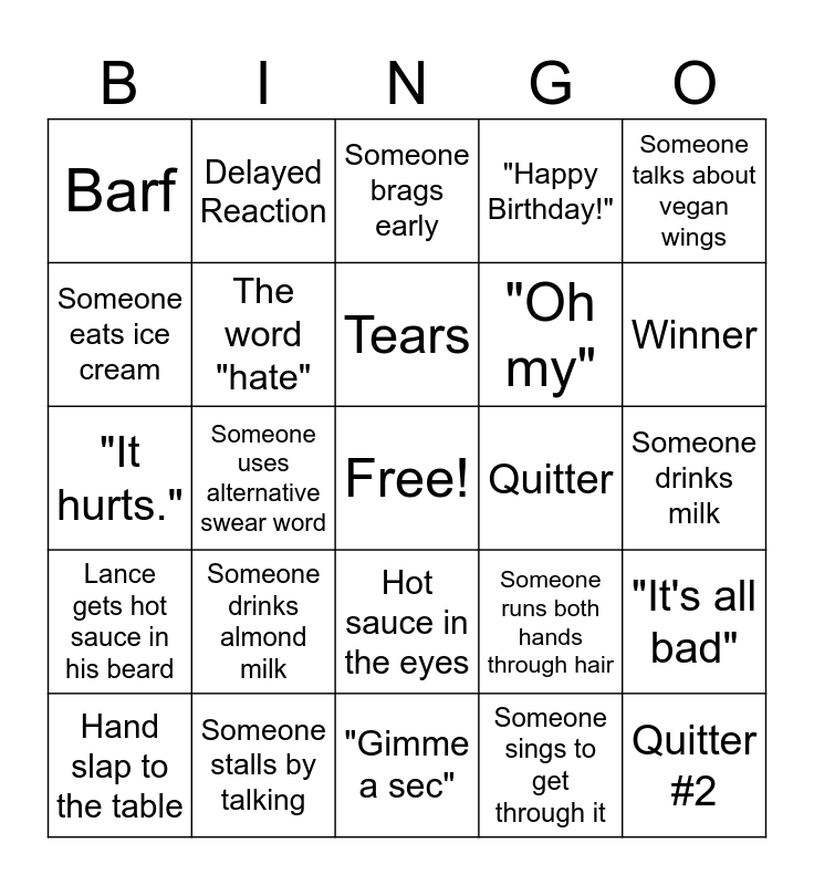 This bingo card has a free space and 39 words: Sharp inhale, Snotty Running Nose, "F*CK!", The word "hate", Hand slap to the table, Hot sauce in the eyes, Tears, Coughing, Someone talks about vegan wings, Lance gets hot sauce in his beard, Someone uses alternative swear word, "Happy Birthday!", Quitter #2, Someone drinks milk, Quitter, Someone drinks almond milk, Someone wipes sweat from cheeks, Barf, Voice changes pitch, Someone runs both hands through hair, Someone eats ice cream, "Gimme a sec", "Oh my", Winner, The word "butthole", "WHAT IS THAT", "It's not that bad", "I can't", Signs of peer pressure, Delayed Reaction, "Don't touch your eyes", Hiccups, Someone brags early, Someone stalls by talking, Someone sings to get through it, "Disgusting", "It's all bad", "It hurts." and Someone wants their mommy.