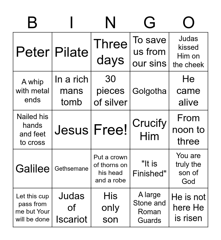 This bingo card has a free space and 24 words: Gethsemane, Judas of Iscariot, 30 pieces of silver, Let this cup pass from me but Your will be done, Judas kissed Him on the cheek, Peter, A whip with metal ends, Pilate, Crucify Him, Put a crown of thorns on his head and a robe, Golgotha, Nailed his hands and feet to cross, "It is Finished", You are truly the son of God, In a rich mans tomb, A large Stone and Roman Guards, From noon to three, Three days, He came alive, Jesus, He is not here He is risen, Galilee, To save us from our sins and His only son.